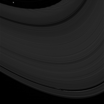 Today of course we’ve seen those rings up close, though the robotic Pioneer, Voyager, and now Cassini missions. We know that they are very wide — about 73,000 km wide — and very thin — only about 10 meters thick at their thickest point, and made almost entirely of ice. That by itself isn’t too surprising–rotation tends to flatten things out (think about a potter’s wheel)–but it’s amazing how beautifully-structured the rings are. In the picture above, you can see spiral ripples at the top of the image, caused by the passage of the tiny moon Pan in the top left corner.