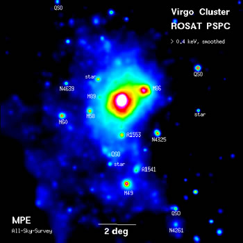 The gas between galaxies, known as the intracluster gas, has temperatures between 10 million and 100 million Kelvins (which are actually about the same numbers for Fahrenheit as well). This gas is hot enough for nuclear fusion, but in a cluster it isn’t dense enough for that to happen. Instead, as it zips around, it emits light in the X-ray portion of the spectrum. In visible light, a cluster looks like galaxies; in X-ray light, a cluster looks like a big glowing blob, with the galaxies hardly registering. In fact, to an X-ray astronomer, the cluster is the hot gas – it’s how they find clusters and characterize them. You may recall that temperature is a good proxy for the speed of atoms in a gas: low temperature means slow, high temperature means fast. The incredibly high temperatures of the intracluster gas are probably due to shock waves from the formation of the cluster: clusters are built of smaller structures, so as smaller groups of galaxies merge, they heat up until the gas glows ever more brightly.