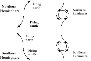 For ordinary everyday projectiles like baseballs, the Coriolis force isn’t very large: the distances and speeds involved aren’t big enough to get a measurable deviation. (It’s also too small to affect toilets and bathroom sinks.) However, when the “object” is a mass of air moving at appreciable velocities, the Coriolis force can be very large, and produces rotations. The rotation is counterclockwise in the northern hemisphere and clockwise in the southern hemisphere, and is known as cyclonic. The specific behavior of the rotation of air masses is complicated by oceans, which add moisture to the air and act as a giant heat reservoir, and by landmasses, which can add dry air to the mix and change the way air flows. This is why hurricanes form over water and become disrupted (eventually) when they make landfall.