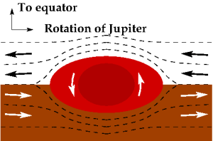 The figure shows Earth (for the moment — I’ll get to Jupiter shortly), with lines of equal latitude marked with the same colors. Every point on Earth completes one rotation about the axis in the same amount of time — roughly 24 hours. This means a point on the Equator (blue line) has to move faster than a point nearer the pole (red lines). Imagine then shooting a cannon due north from the green line in the northern hemisphere; as the cannonball flies north, the surface keeps moving under it, so it actually lands at a point northeast of its starting position. (Remember Earth rotates from west to east, which is why the Sun rises in the east and sets in the west.) How far east it lands depends on how fast it was traveling, and of course what the original latitude was — the effect will be stronger closer to the equator. If you fire the cannon due south from the green line, the cannonball might actually land southwest of where you fired it, since moving into lower latitudes brings it to where the surface is rotating faster than at its starting point. The path of the cannonball curves as though a force is acting on it — the Coriolis force. This effect is opposite in the southern hemisphere.
