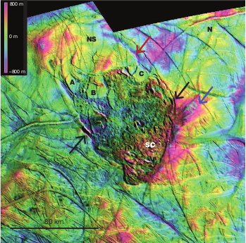 Europa is still not absolutely smooth, however: its surface is covered in fissures, grooves, and domes known as chaos terrains. These domes, which can be as high as 200 meters, are the focus of the new model proposed by B. E. Schmidt, D. D. Blankenship, G. W. Patterson, and P. M. Schenk. The researchers began by comparing certain features on Europa’s surface to ice layers in places such as Greenland and Antarctica on Earth. Below the ice in Greenland and the like, hydrothermal vents melt the ice from below, but surrounding ice prevents the liquid water from flowing away. In this way, a lake begins to grow, with ice on all sides and above. However, the difference in density stresses the ice, fracturing it into blocks that float on top of the water at a higher level than the surrounding ice. Since the cracks allow heat energy to escape, the overall temperature of the region cools off, refreezing the water. The formerly-floating blocks now make a dome – precisely how the chaos terrains appear in topographic studies of Europa’s surface. On Earth, no matter how big the ice cap, eventually the ice must come to an end in land or open ocean, but on Europa with solid ice extending all the way around the globe, the surface must crack and refreeze continually over the millennia.