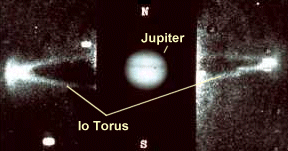 Like most moons, Io lacks any kind of substantial atmosphere, though the plumes from the volcanoes produce a trail of despair effluvia as the moon orbits Jupiter. (Technically speaking, Io has an exosphere: a tenuous atmosphere that varies a lot with time and temperature. Earth also has an exosphere, far above the breathable layer we live in.) The clouds of sulfurous material form a donut-shaped region around Jupiter known as the Io torus.