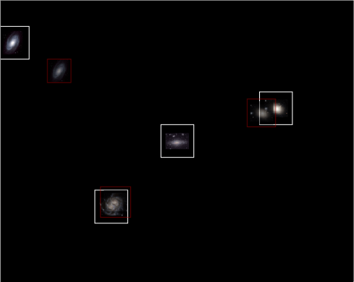 Think about a galaxy emitting a pulse of light (a flare from its central black hole, for example): the light will travel across space until it reaches our telescopes, but the universe is expanding the whole time. That means we’re seeing where the galaxy was, not where it is now: it’s actually farther away. Also, since we are effectively looking into the past, we’re seeing a smaller cosmic box containing that distant galaxy than its box is now. The image below depicts the reality and the appearance superimposed.