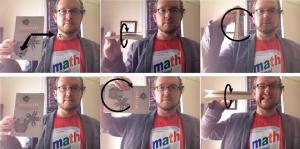(I’m going to follow standard mathematical practice and leave out the multiplication sign when I’m using symbols as opposed to numbers.) That very feature turned out to let us describe rotations in three dimensions, where taking rotations in different orders will give you different results, as shown in the very elegant photocomic rerun from the earlier post. We say that if the order of multiplication doesn’t matters, the numbers commute, so real numbers and complex numbers commute, while quaternions do not.