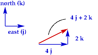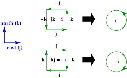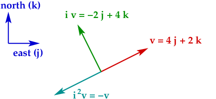 Let’s label the north direction with k and the east direction with j, so that we can write the velocity as the sum of how fast it’s going in the north direction and how fast it’s moving in the east direction, as shown. For those of you who read my earlier post on quaternions, this notation should look a little familiar—we’ve written the velocity using the quaternion imaginary units. As with the usual imaginary number i, the square of j and k is -1: