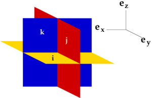 If we stick to stuff in two dimensions, our lives aren’t very complicated. There is only one plane in which to rotate, but in three dimensions, you have an infinite number of planes for rotation! Well, that’s overstating the problem: just like we can pick three perpendicular directions (east-west, north-south, and up-down), we can pick three perpendicular planes for rotations and write all the others as combinations of those three. In fact, thanks to our tutorial in two dimensions, we are already primed to think of planes of rotation using quaternions, so let’s label each plane with a quaternion unit, standing for bivectors. Rotation in a clockwise direction in the x-y plane is indicated by i, rotation in the y-z plane is indicated by j, and in the z-x plane is indicated by k.