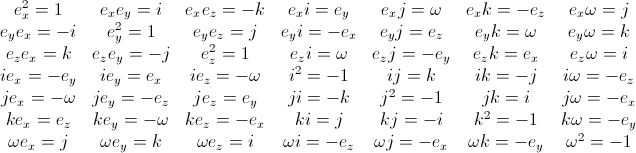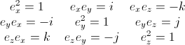 If we’re using quaternions for bivectors, we should introduce another mathematical beast for the x, y, and z directions. I won’t use Clifford’s notation, but I’m definitely following his practice by writing three new vectors ex, ey, and ez that have the following multiplication table: