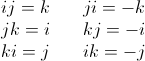 (Aside: for those of you who have seen vector algebra, you might be wondering why we use i, j, and k for quaternions when you used them for unit vectors in the x, y, and z directions. The answer is that American physicist Josiah Willard Gibbs took quaternions and used the symbols for his own system, in common use today. I actually find Gibbs’ system frustrating because it only works in three dimensions and thus is useless for relativity. Even stuff like rotations are fairly awkward, so when you get into higher-level physics, you have to learn a whole new set of operations. I don’t like that: it’s inefficient. I think Gibbs came up with his system to punish the world for being named “Josiah Willard”.)