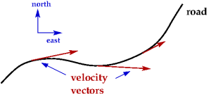 Imagine a car, driving down a winding road. Let’s not worry about elevation and assume the country is flat (compared of course to the curvature of Earth), so if you look down from above, you’d see the car trace a path in two dimensions. If we read the speed of the car off its speedometer and its direction by the way its headlights are pointing, we’d have a complete picture of the car’s position and motion at each point along the road. Following the normal convention, let’s draw axes along the north-south direction and the east-west direction; then we can draw a little arrow pointing in the direction of motion whose length is determined by the speed of the car.