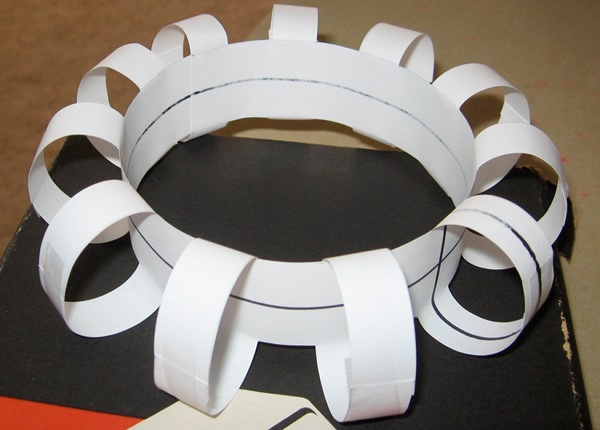 As I mentioned the other day, I recently acquired a neat little book called Experiments in Topology by Stephen Barr, dating from 1964, though you can get a paperback reprint from Dover Books. Since I’m still at my parents’ house for another two days, I don’t have access to all my other books or (more importantly) the graphics programs I use, so I won’t attempt to liveblog my reading of the book. However, in the spirit of my earlier posts on Möbius and topology, I borrowed some scissors and raided the local paper supply to illustrate in photos what I can’t diagram.