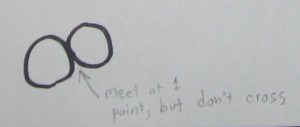 Two curves on a normal piece of paper like this (with or without a hole) can meet at a single point, but they can’t intersect at only one point. One may enclose the other, but if they intersect, they must cross twice. This also is true even if one curve isn’t closed, as long as it doesn’t have end points.