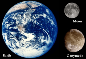 That moon is Ganymede, one of the four Galilean moons discovered in January of 1610. Its diameter is 41% of Earth’s, putting it between Mercury (38%) and Mars (53%) in size. Ganymede’s structure is complex: most of its mass is in a molten iron core with a mantle of rock surrounding it. As with Earth, the molten core produces a magnetic field, though Ganymede’s field is much less strong, swamped by Jupiter’s powerful field. Outside the core is a thick sandwich of water ice (possibly mixed with ammonia), whose filling may be a salty ocean; rocks from the depths are trapped in the ice. In some ways, it seems as though a tiny terrestrial planet became frozen over. Since water ice is much less dense than rock, the 800 kilometer- (500 mile-) thick ice shell contributes far less to the rotation of the moon than the core.