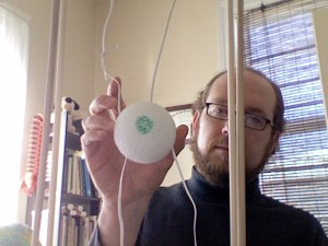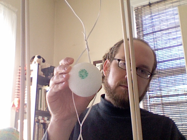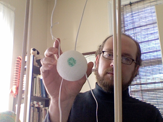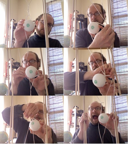 We’ll start again with a sphere, but we’ll suspend it using elastic bands from a frame. My quick-and-dirty electron model uses scrap pieces of 1×4, 3/8” doweling, 1/8” elastic, and a styrofoam ball (the latter items from a craft store). I used two elastic bands running through holes in the styrofoam ball, but you could get away with one thick band if you design it right. (Three or more bands might be more stable, but harder to manipulate.) For convenience, I put a dot on one side of the ball; turning the ball 360° around the axis brings the dot back to its original configuration, but the elastic is twisted, so the entire system is not restored.
