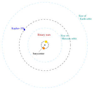 Take, for example, the exoplanets known as Kepler-16b (“Tatooine”, which I wrote about on this blog), Kepler-34b, and Kepler-35b (which I covered for Ars Technica). These three planets are circumbinary: they each orbit a binary, two stars instead of one. These three star systems have several things in common: the stars are in tight mutual orbits, while the planets follow a larger path encompassing both of them. Systems where the binary has a larger separation are far less likely to have stable planet orbits: in that kind of situation, the planet will orbit chaotically and eventually be ejected from the system. (This may also happen even in tight binaries, though based on my understanding, they’ll stick around much longer—possibly as long as the stars themselves survive. In fact, our own Solar System may not be stable forever, though it’s nothing to lose sleep over.)