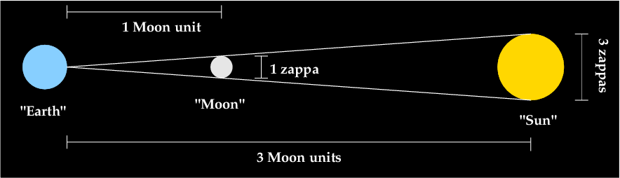 This is basic geometry, which you may remember from high school, and we can go far with it. If the Sun is 20 times bigger than the Moon, than it must be 20 times farther away to appear the same size. In the real Solar System, the Sun is 412 times the size of the Moon (412 zappas in diameter), and it is 395 times farther away from Earth (395 MU) on average, with a bit of variation due to the eccentricities of orbit. Therefore, the Sun generally appears very slightly larger than the Moon in the sky, but the difference in appearance is small enough to be insignificant most of the time.
