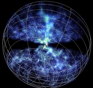 It’s simple to see how structure formation works. Small halos provide an initial gravitational attraction for gas, which collects and forms stars and small galaxies. The smaller galaxies are attracted to each other, and merge into larger galaxies. The larger galaxies in turn grow by merging with similarly sized objects, or devour smaller galaxies, then throng together as clusters. We observe the large-scale structure (LSS) of the Universe through galaxy surveys, such as the 6 Degree Field survey shown at right.