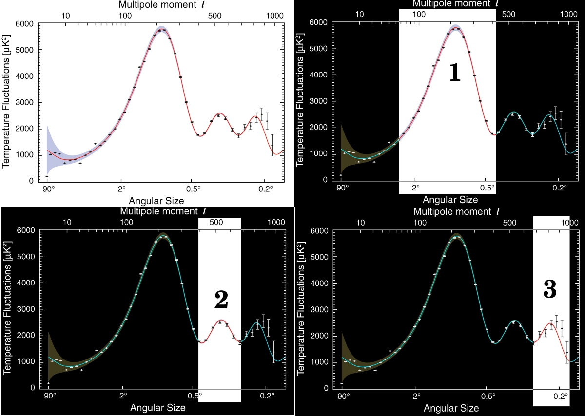 The solid line in the power spectrum is the theoretical model that fits the data best. The way theoretical cosmologists work is by changing a bunch of parameters simultaneously and comparing to the real CMB power spectrum. In other words, it’s possible there may be another explanation that fits the CMB data, but doesn’t include dark matter—but I have yet to see a convincing one.