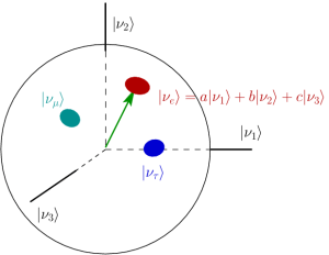 Neutrinos don’t decay, but they do change flavor. This is known as neutrino oscillation, and it’s due to an odd quantum property of the particles. Each of the three neutrino flavors is actually a mixture—a superposition—of three quantum states with different masses, which we label ν1, ν2, and ν3. Think of it as like the (x,y,z) coordinates on the surface of a sphere: the total “position” on the sphere’s surface is the neutrino flavor, but the “coordinates” are the hidden mass states. However, it doesn’t stick to one spot: the state of the neutrino travels across the sphere’s surface, eventually coming back to its starting point (hence the name “oscillation”). In less abstract terms, this means as a neutrino propagates, it changes from one flavor to another. I’ll discuss the implications of this change for experiments in the next section.