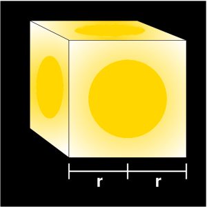 We’ll call the distance from the star at the cube’s center to the edge of the cube r, so the length of one side of the cube is 2r. What happens if we want to look at the star from double the distance away? That’s equivalent to taking eight copies of our original cube, making each side of the new cube 4 times the area (see the image to the left). Similarly, if you want to look at the star from triple the distance away, you make a cube where each side is 9 times bigger than the original, equivalent to 27 of the cubes we started with.