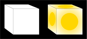 If the total number of photons incident on the box is the same, regardless of size and shape of the box, then we can use that to help us determine how bright a star appears from a long distance away. A star emits light more or less equally in all directions—I’ll come back to that “more or less” at the end of the section—so for simplicity we can make the box a perfect cube with the star at the center. (Usually when I taught this subject in physics or astronomy class, I used a sphere instead, but again, since we’re dealing with topology, the shape choice is arbitrary. We’re not after all the mathematical details.) We’ll say the size of one cube face is A, so the total surface area of the cube is 6A (like an ordinary die you might use to play Monopoly or Yahtzee or whatever). Each side of the cube will have an equal amount of light passing through it.