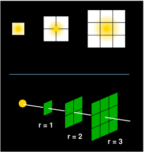We’re interested mostly in the relationship between surface area and distance from the star, not the number of cubes. After all, the photons spread themselves across the surface of the box. However, the surface of the whole box grows at the same rate as each side, since the total surface area is just 6 times the area of one side. This means we can stick with one side, as shown in the lower panel of the image at the left. The total number of photons passing through each set of green squares is the same; they are just spread out more and more the farther you get from the star. Notice there is a relationship: at r = 1, we have one square, at r =2 we have 2*2 = 4 squares, and at r = 3, we have 3*3 = 9 squares.