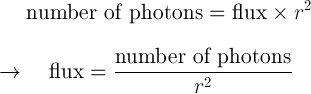 Let’s put all this together: the number of photons is constant, while the area they pass through increases with distance. However, that means each square of the 9 at r = 3 will only receive about 1/9 of the light that the single square at r = 1 gets. We’ll call the light received per square the flux, and we can write what we’ve learned as two equations conveying the same information: