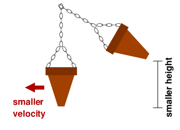 Conservation of energy tells us that the murderer can use gravity to give the cactus pot a high speed—but they have to give it a long chain. As it turns out, the key quantity is the vertical distance the pot moves: if it falls through a larger height, it will have greater speed at the bottom. The horizontal distance is actually irrelevant in this case! If you rigged a booby trap with a mass that falls directly downward through the same height, it would have the same speed as the cactus pot when it reached the victim’s head. (I use the term speed deliberately. Velocity, which is a related important concept, involves both speed and direction, but energy doesn’t depend on velocity—only how fast the object is moving.) Interestingly, the mass of the pot doesn’t affect how fast it moves at the bottom of the swing, as long as we can neglect air resistance—which we can in this case, since the pot is heavy enough and is moving through a relatively small distance.