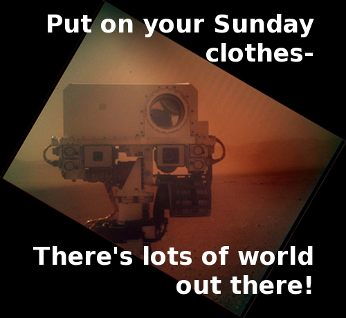 Mars Curiosity has an inspiring message for you. [Photo credit: NASA/JPL/MSSS/Emily Lakdawalla; Caption credit: moi]The Mars Curiosity rover has so many cameras on a variety of mounts, it can take photos of itself. While the dust cover was still on the camera known as MAHLI (MArs Hand Lens Instrument, mounted on the robotic arm), the picture clearly shows the mast array on the rover. Emily Lakdawalla of the Planetary Society cleaned up and rotated the image (since MAHLI’s orientation made it take a skewed photo), then invited captioning. How could I resist?