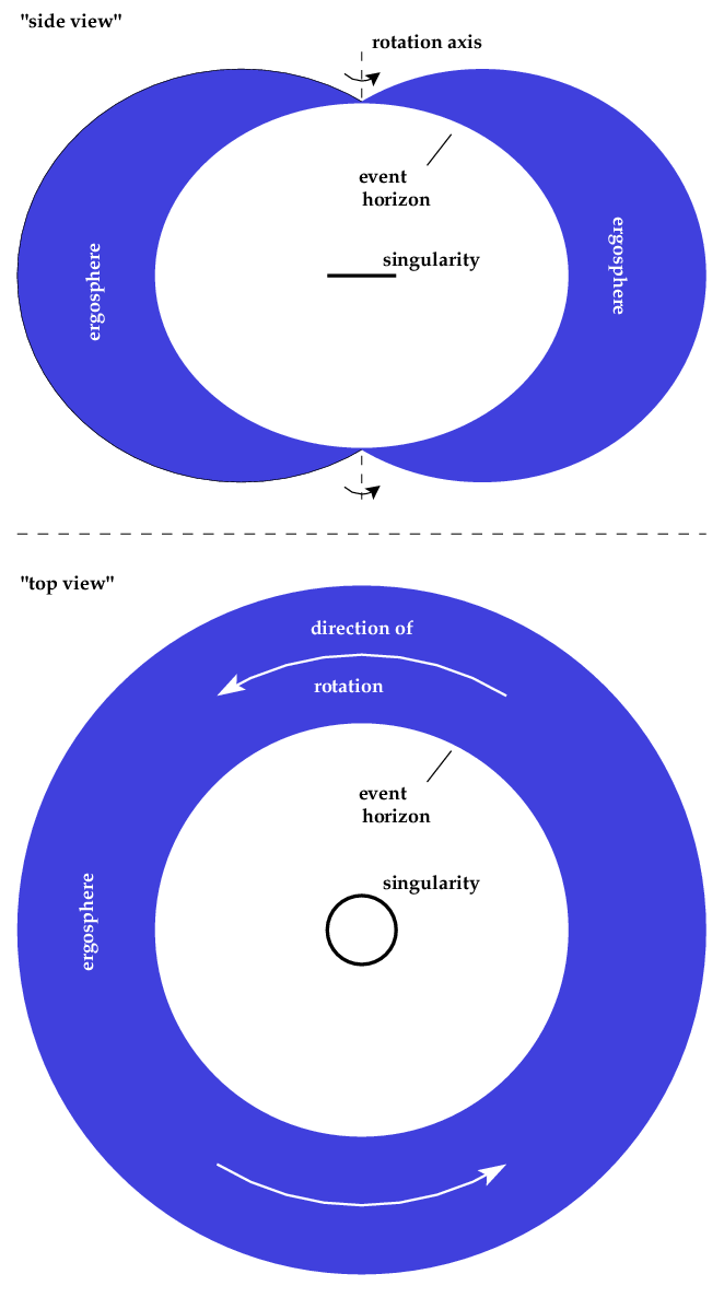 At this point, I’ll break away from my Ars Technica article draft, since we need to understand a bit about black hole structure to see why this study is a big deal. The diagram below shows a rotating (or Kerr) black hole; the rotation makes the event horizon bulge out, but it also produces an interesting region known as the ergosphere. While the event horizon is the boundary of the black hole (being the point of no return), the ergosphere is a region where nothing can remain at rest, no matter how fast it moves.
