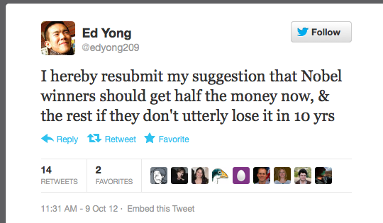 As Ed Yong’s tweet above indicates, Nobel laureates are also fallible humans, not demigods. Many laureates have embraced pseudoscience, crackpottery, racism, sexism, or just gone plain nuts. Brian Josephson was a promising researcher in superconductivity, but even while he was doing excellent science, he became a true believer in psychic phenomena and gave up experimental physics in favor of paranormal research. Laureates William Shockley (one of the developers of the transistor) and James Watson (co-discoverer of DNA) both have made publicly racist statements. Being brilliant in one area doesn’t mean one is immune from being a fool in another, but the prestige of the Nobel Prizes can sometimes make us forget that.