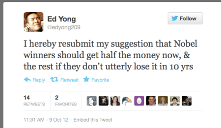 Of course, another part of the problem is that the Nobels aren’t really the arbiter of good science. A lot of good research goes on that the Nobel Prizes never acknowledge, because it isn’t sufficiently groundbreaking (in the view of the committee), the researchers are dead (the prizes are rarely granted posthumously), or possibly it’s too hard to figure out which researchers to award (getting back to the whole collaboration-vs.-individual issue). Carl Zimmer eloquently expressed these and other problems with the Nobels last year, so I won’t go on.