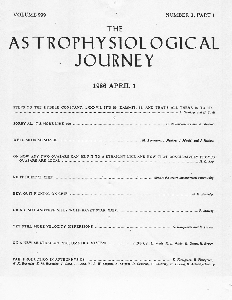 Returning to the Astrophysiological Journey: the fourth, fifth, and sixth items are also telling. Halton “Chip” Arp built his reputation around an excellent catalog of interacting galaxies, which helped astronomers characterize the role of mergers and collisions in galactic evolution. However, he staked that reputation on a misguided attempt to prove that the Big Bang didn’t happen, and that the apparent motion of distant objects (such as quasars) due to cosmic expansion was actually due to an intrinsic effect. There was no real debate on the subject, but many astronomers participated in a bit of a pile-on—understandably since Arp’s ideas were so blatantly incorrect. However, from the parody table of contents, it might even look like the Arp-vs.-nearly everyone else conflict was coequal to the real challenge of determining the Hubble parameter.