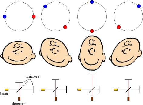 ![Here's a simple representation of gravitational waves, from a binary system consisting of equal-mass pulsars. If we're viewing the system "face-on", the wave will cause a ring of particles to distort aligned with the orientation of the pulsars. Charlie Brown's head (which is not an approved gravitational wave detector) wouldn't actually distort this much because the internal forces are much stronger than gravity. However, if we constructed a detector with movable mirrors, they could play a similar role. [Credit: moi/Charles Schulz]](https://galileospendulum.org/wp-content/uploads/2013/03/gw_detector.png?w=472&h=346)