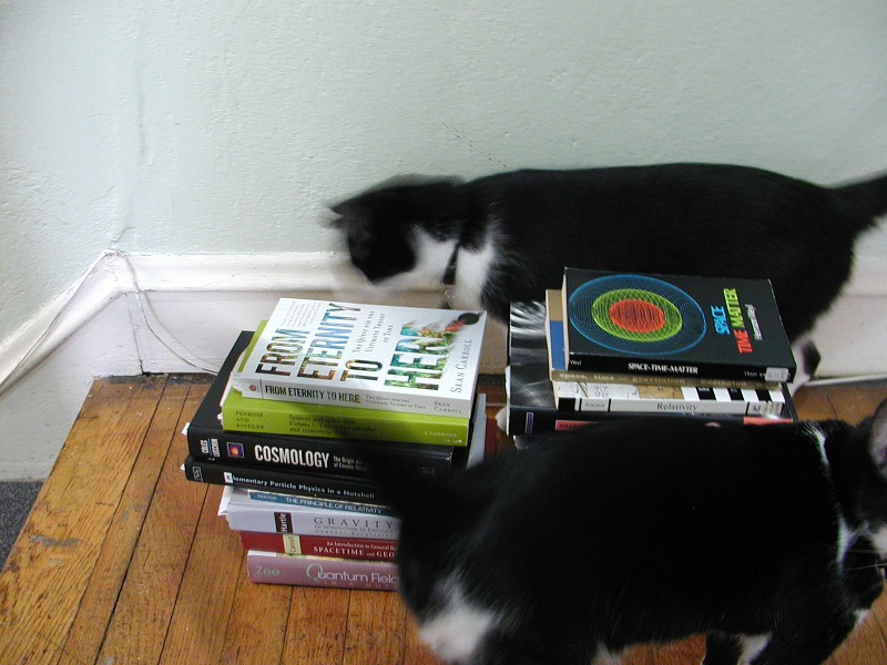 A small representative sample of my relativity books, with my cats Pascal and Harriet for scale. Even more: Einstein is not the last authority on relativity, but the first. I counted 64 books on my shelves that deal with the theory of relativity somewhere in their pages, and it’s possible I missed a few. The earliest copyright is 1916 [6]; the most recent are 2012, more than 50 years after Einstein’s death. The level runs from popular science books (such as a couple of biographies) up to graduate-level textbooks. Admittedly, the discussion of relativity may not take up much space in many of those books – the astronomy and math books in particular – but the truth is that relativity permeates modern physics. Like vanilla in a cake, it flavors many branches of physics subtly; in its absence, things just aren’t the same.