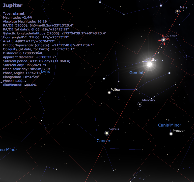 The problem, as you can see from the star chart at right, is that Jupiter isn’t in Cancer at all. The Zodiac used by most astrologers in the US is based on the constellations as they were about 3,000 years ago, when ancient Babylonians developed their system. While Babylonian astrology influenced astronomy that came later — the 360 degrees in a circle is due to them, for example — a lot has changed in 3,000 years. In particular, Earth’s axis precessed: it points in a different position today than it did thousands of years ago. Polaris is the North Star today, but it wasn’t back then, and the Sun no longer moves through the constellations of the Zodiac at the same times of the year as it used to. Think you’re a Cancer? You’re not: the Sun was actually in Gemini when you were born. Update: As the commenter below notes, astrology abandoned the connection between the houses of the Zodiac and the constellations that originally gave them their names. Obviously this has no bearing on astrology’s claims to truth, since planets’ positions don’t affect your life either way.