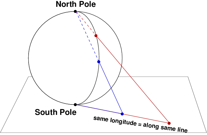 In the stereographic projection, you rest Earth (or whatever spherical object you’re working with) on an imaginary flat surface that will serve as your map. For each point on the globe, you draw a line connecting it to the North Pole and extend it until it reaches the map. All points on the same longitude line will lie along the same line on the map, and latitude lines will be circles. However, one point won’t be include on the map: the North Pole itself, since you can’t draw a unique line from the North Pole to itself that connects with the plane. In a mathematical sense, the North Pole lies at infinity in all directions on this map, something that’s perfectly OK in pure math (and I hope to return to that topic, as it relates to the geometry of spacetime and the behavior of elementary particles) but impractical for us.