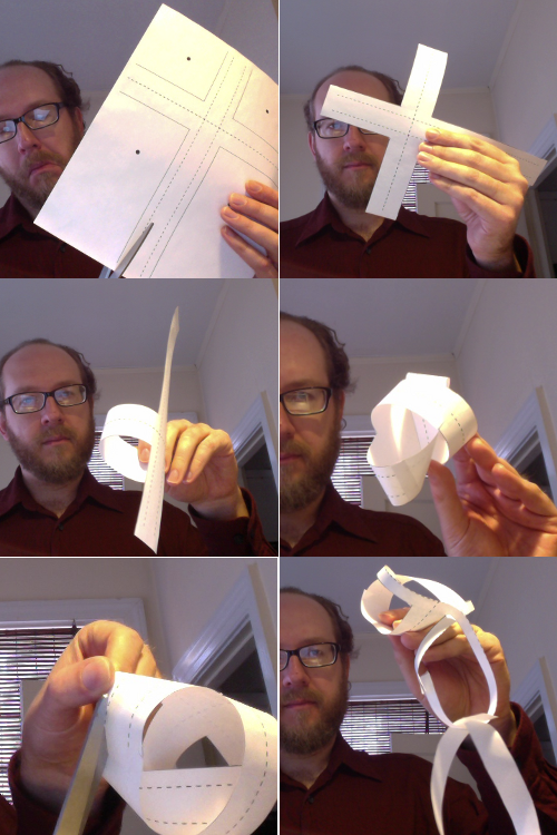 The first thing to note is that the order of cutting makes a big difference: if you cut along the dashed lines before you make the bands of paper them into Möbius strips, you’ll just end up with a bunch of smaller strips of paper, which is boring. However, if you make Möbius bands first, cutting along the dotted lines does something different in each case. Questions for you: is the result one or more Möbius strips? Are they linked or unlinked?