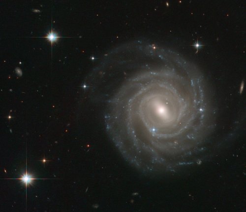 UGC 12158 is significantly bigger than the Milky Way: about 140,000 light-years across, compared to our galaxy’s 100,000 light-year diameter. However, if an alien astronomer in another galaxy could see the Milky Way face-on, it would look remarkably like UGC 12158. Our Sun would be too faint to see—the bright stars in the spiral arms of any galaxy are all far more massive and bluer than the Sun—but our alien astronomer colleagues would likely still be impressed by the Milky Way’s beauty.