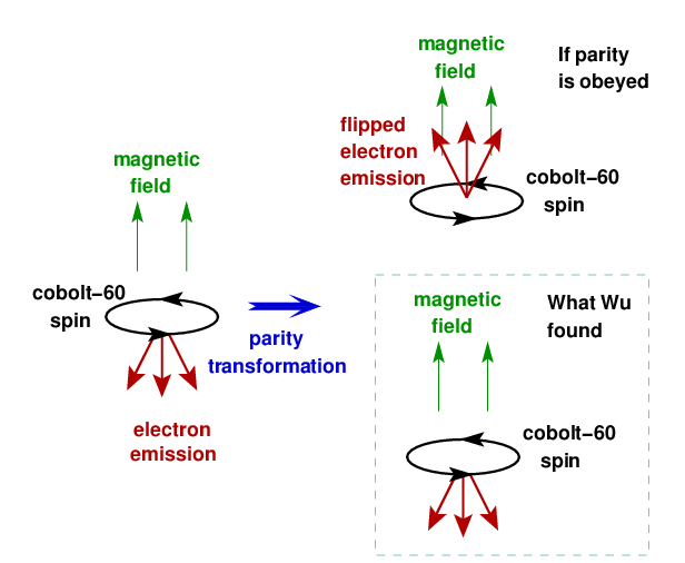 ![Cartoon of the Wu experiment: if parity was preserved, then the emission of electrons would change if you reversed the orientation of the experiment. Instead, she found that the electrons always shot out the same way relative to the cobalt atoms' spin, showing that the weak force violates the law of parity. [Credit: Matthew Francis]](https://galileospendulum.org/wp-content/uploads/2014/03/wu_experiment.png?w=1024&h=840)