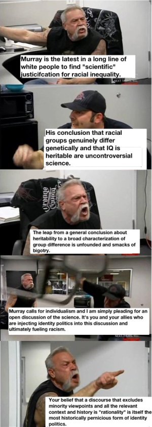 Klein (to his credit) recognizes that he’s the wrong person to debate Harris, but he does it anyway. I think he did a pretty good job under the circumstances, but reading the transcript, it’s obvious to me that Harris thinks the only reason someone would disagree with him is because of their personal bias. In other words, anyone examining the same evidence would draw the conclusion that IQ is an objective measure of intelligence, and that some racial/ethnic groups are just smarter than others. To phrase it more bluntly: everyone is biased on this issue unless they agree with Harris, so black folks who rightfully resent being categorized and dehumanized by this whole discussion are too irrational to be included. Let that sink in.